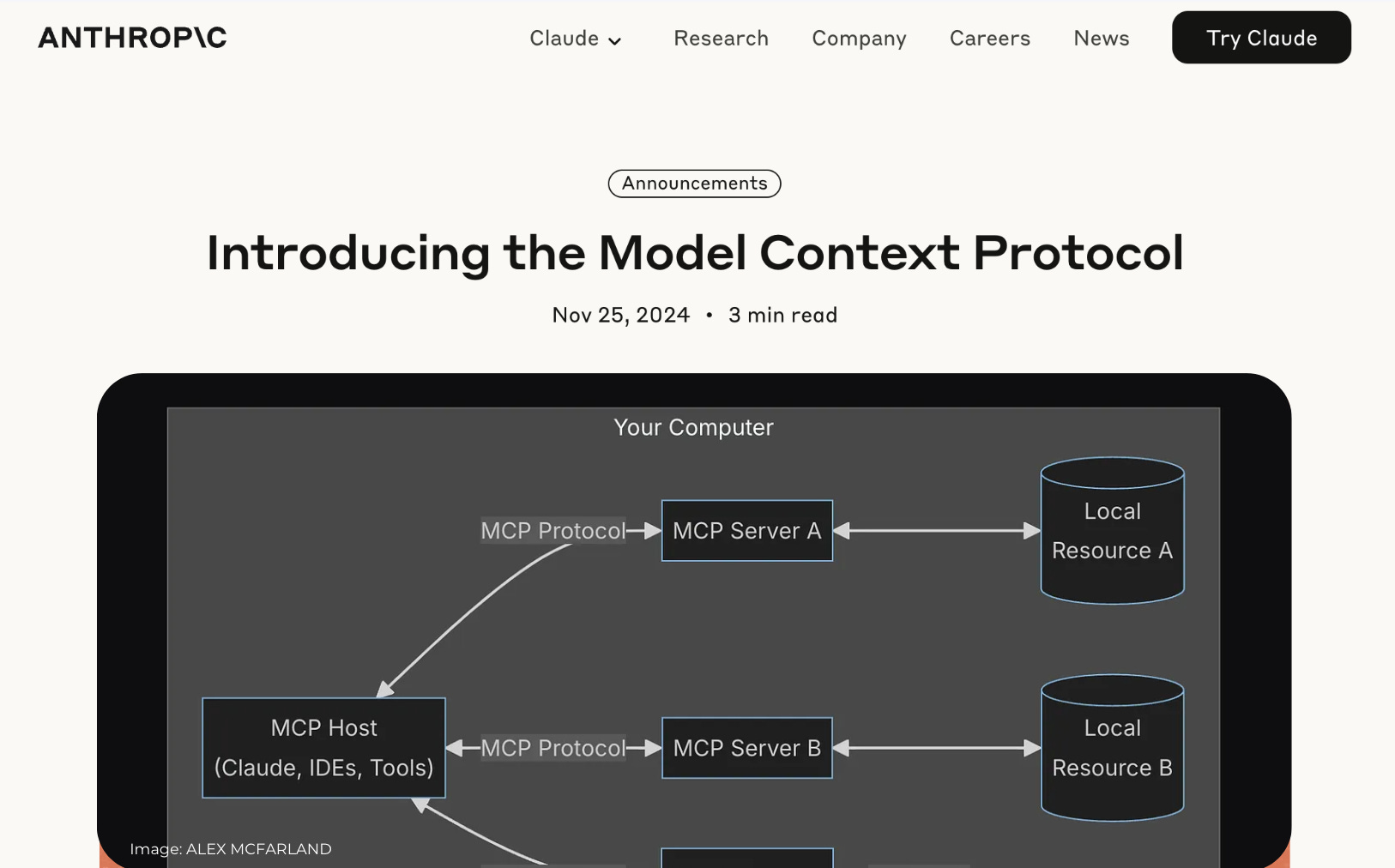 Be smart: MCP is an open standard from Anthropic that allows AI systems to seamlessly connect to business data, cloud tools, and enterprise systems—without endless custom integrations. Think of it as a "USB-C for AI". [Github]