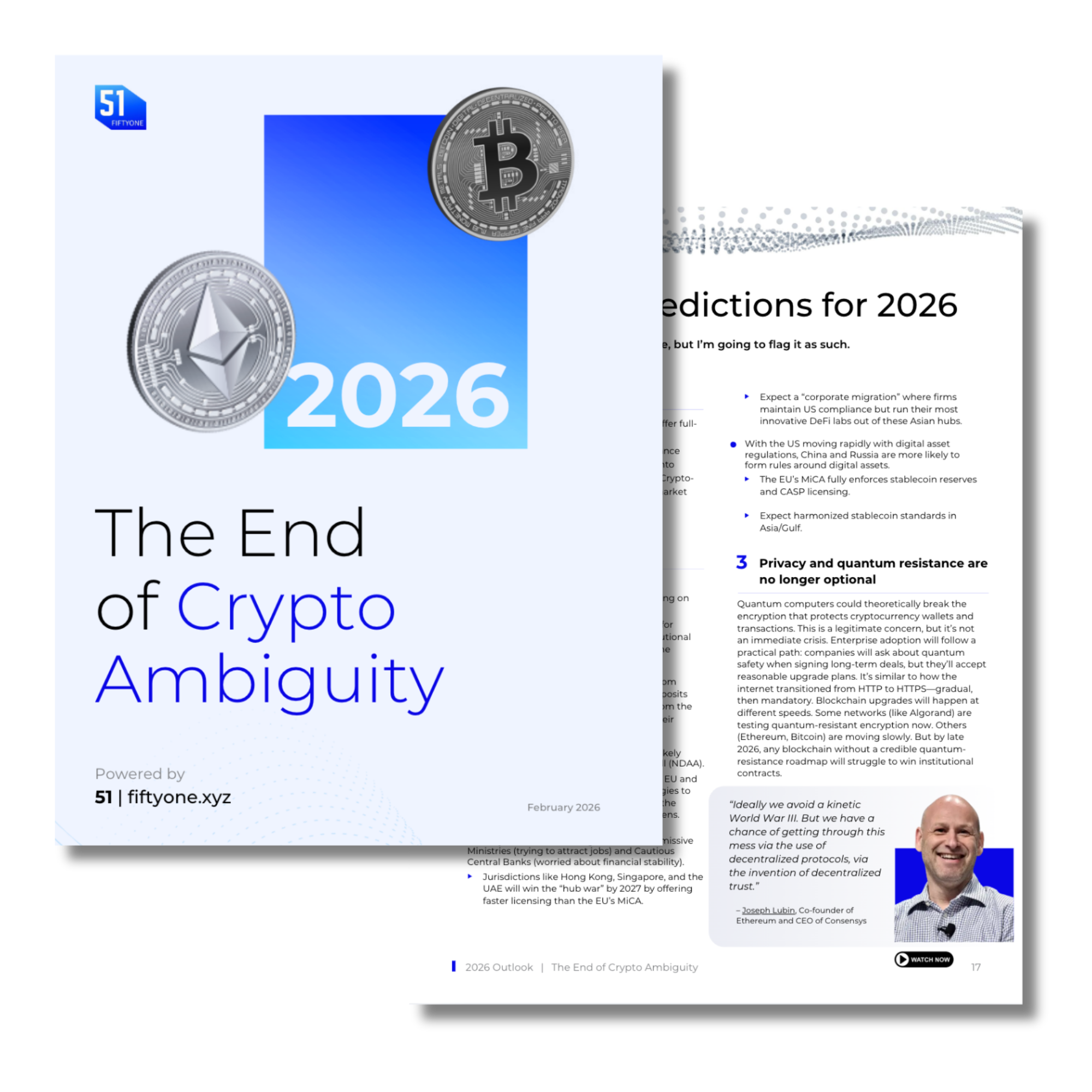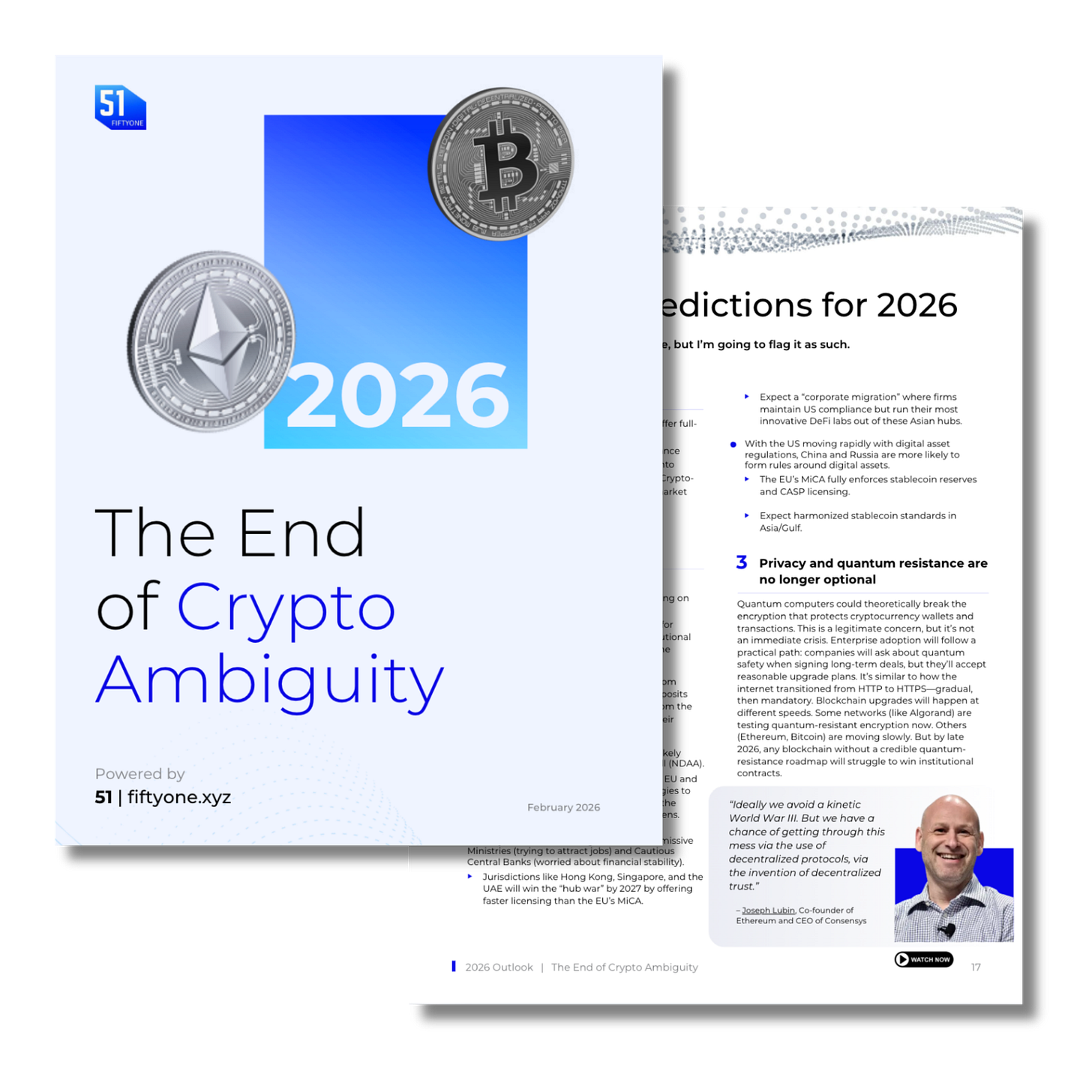 This briefing is based on the FiftyOne 2026 Outlook: The End of Crypto Ambiguity. The full report covers 12 market signals, 8 structural patterns, institutional adoption data, and specific predictions for 2026. Nothing here constitutes investment advice.