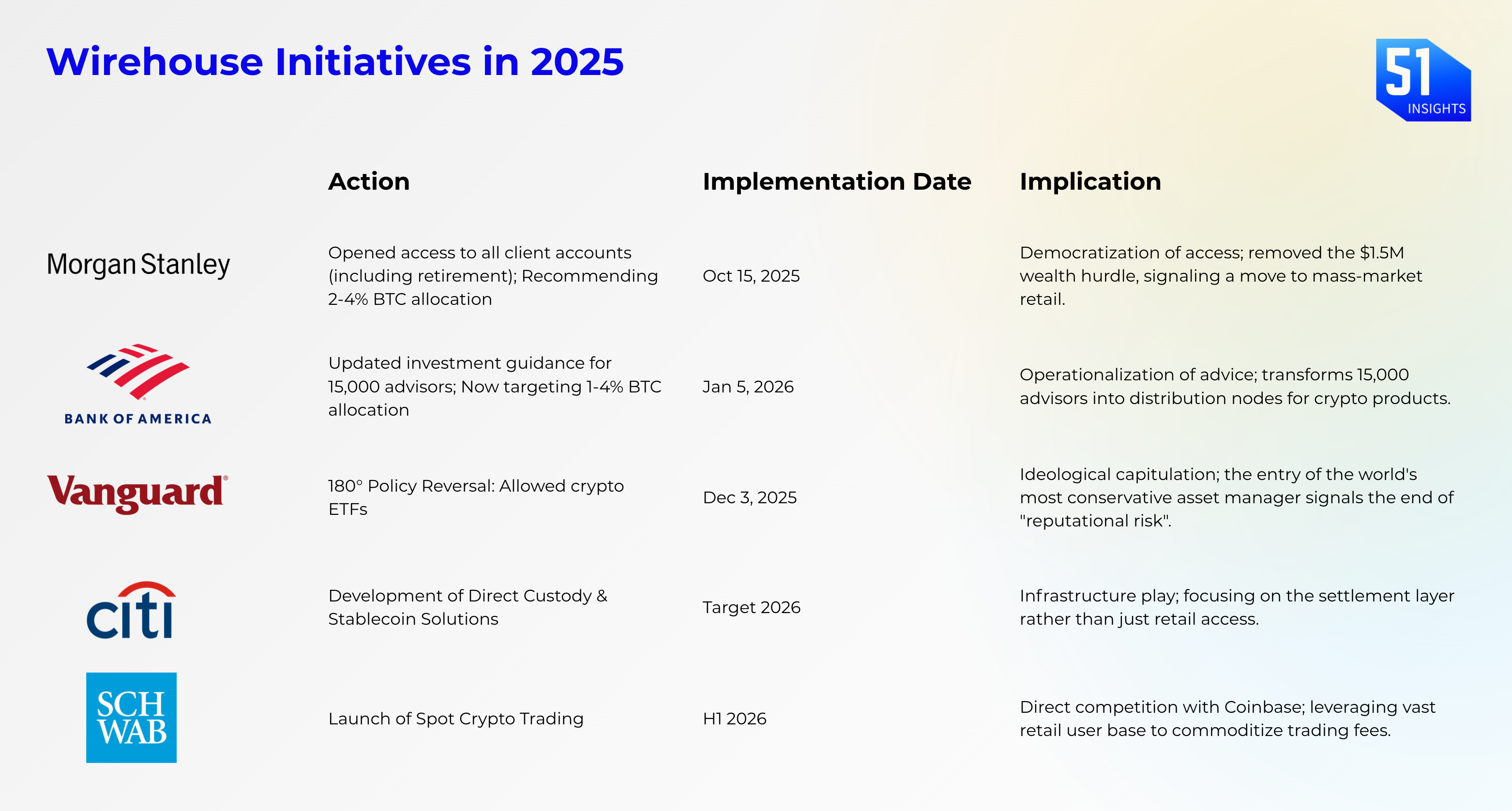 Our view: The “reputational risk” of touching crypto is dead; By guiding clients into 1-4% allocations, banks are effectively ensuring that the next leg of adoption flows strictly through their fee-generating pipes.