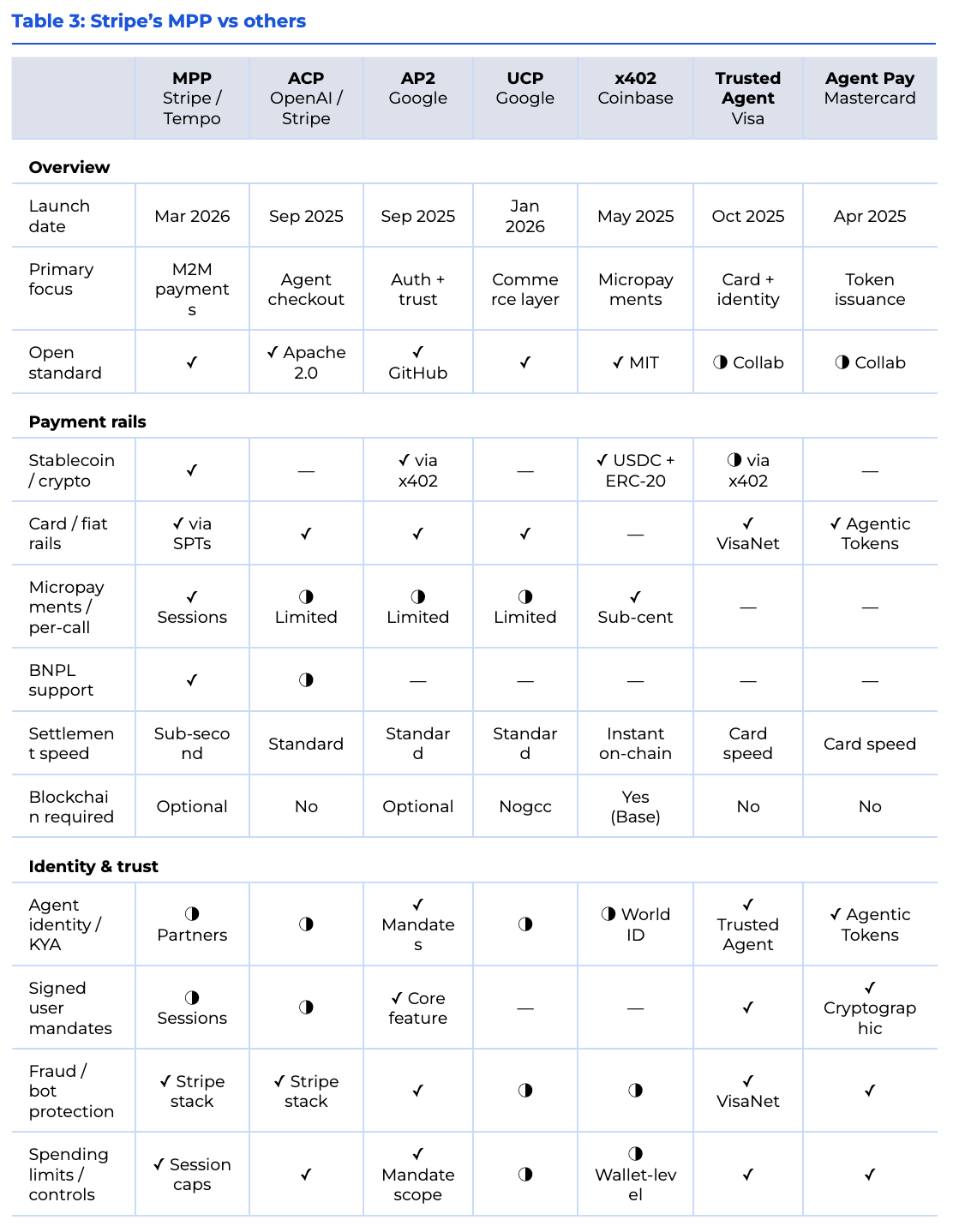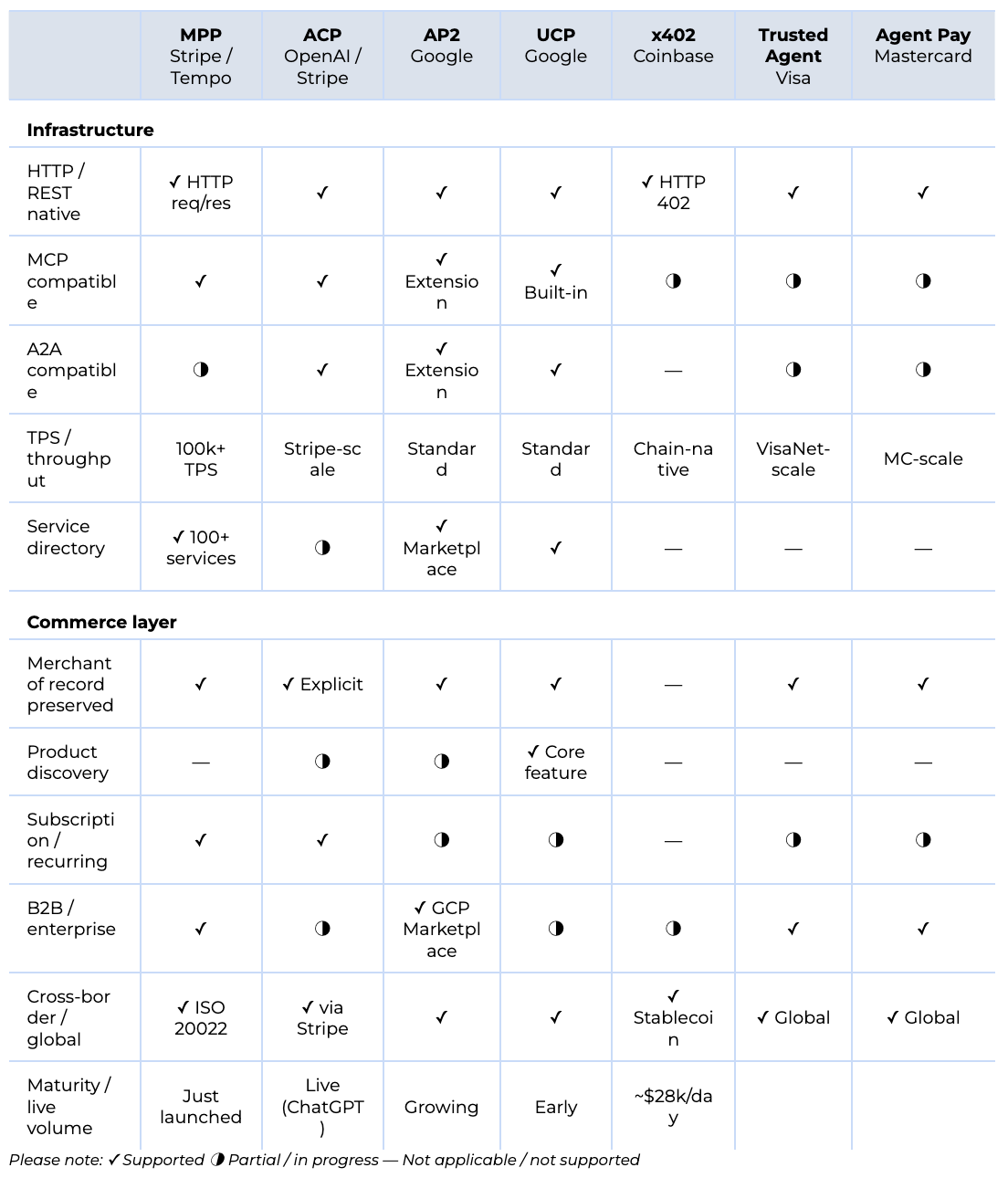 In practice, these layers stack rather than compete: a transaction might use AP2 mandates to authorize an agent, MPP to settle the payment, and ACP or UCP to structure the commerce interaction around it, which is why Stripe, Google, Visa, Mastercard, and OpenAI are all listed as design partners on each other’s protocols.