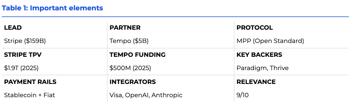 On March 18, 2026, Stripe and Tempo co-released the Machine Payments Protocol, an open specification for machine-to-machine payments. Simultaneously, Tempo launched its mainnet, a purpose-built blockchain backed by $500 million from Paradigm, Thrive Capital, and other investors at a $5 billion valuation. [RELEASE]