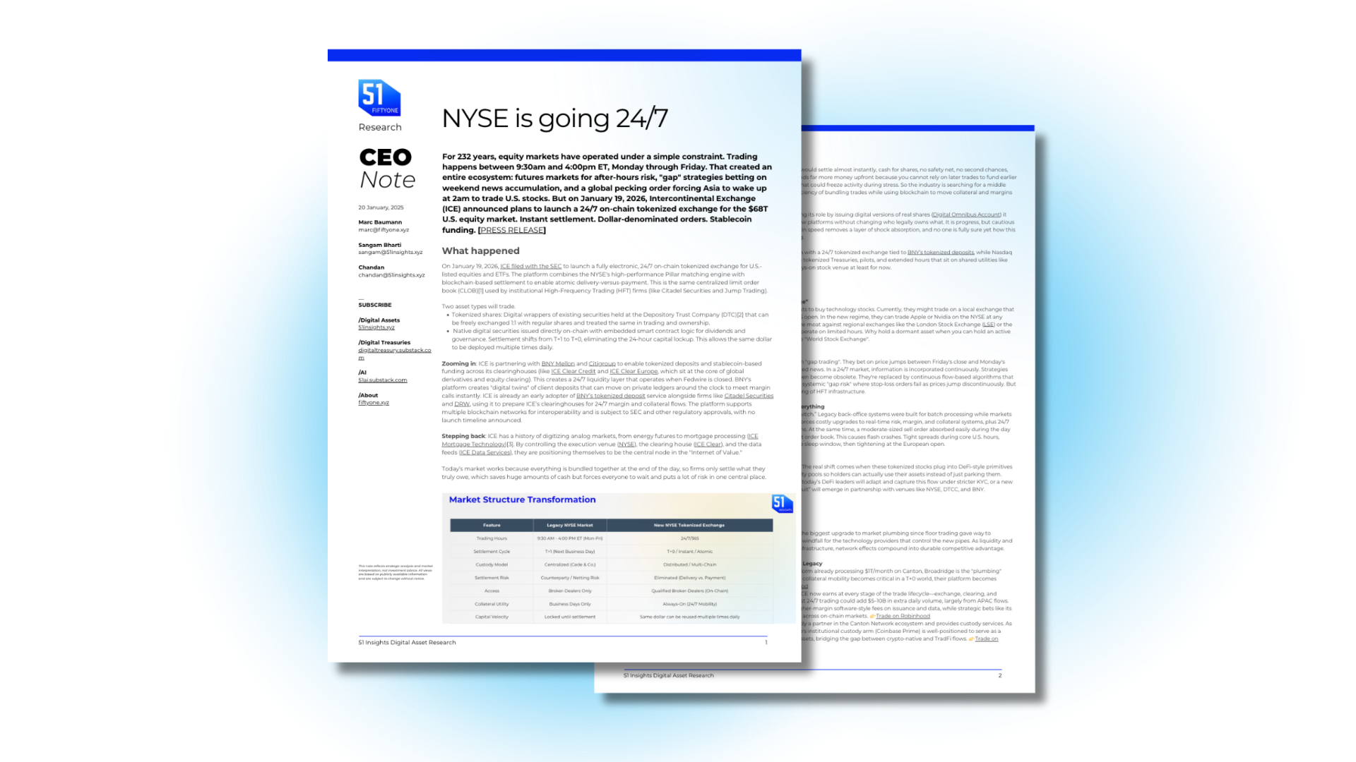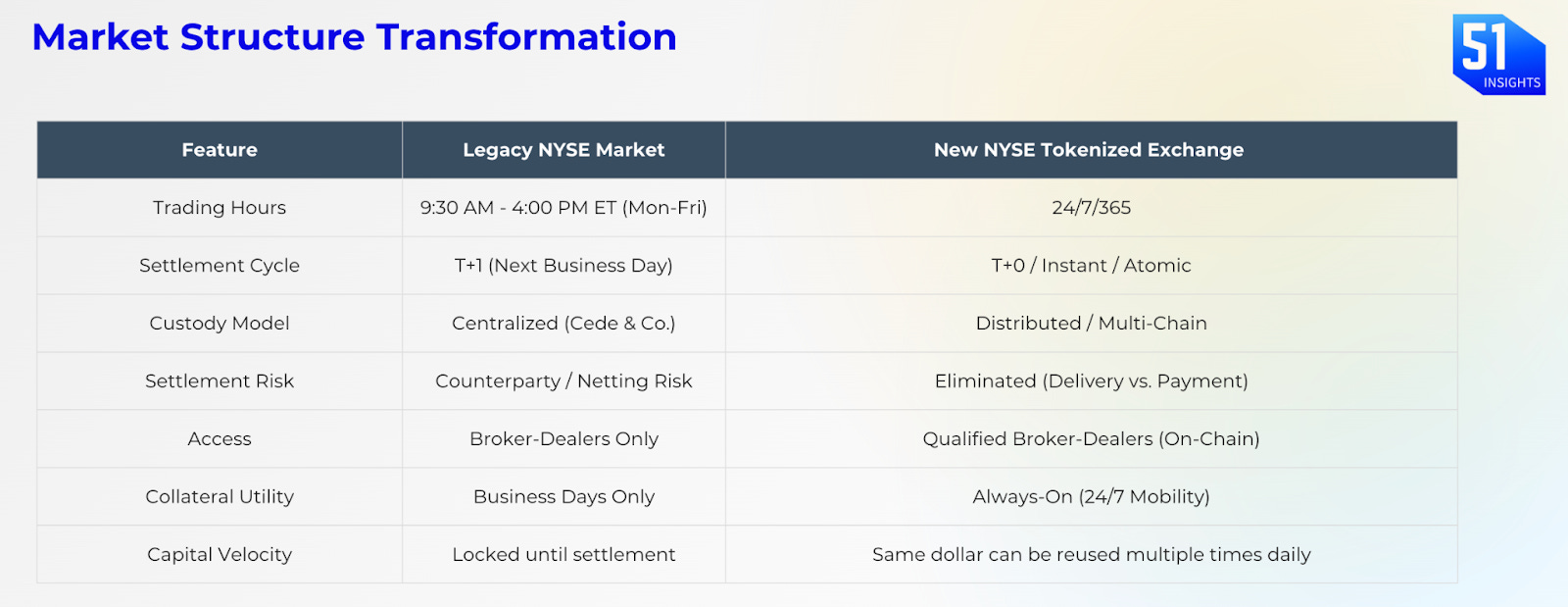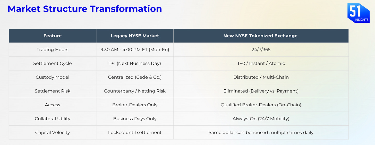 On January 19, 2026, ICE filed with the SEC to launch a fully electronic, 24/7 on-chain tokenized exchange for U.S.-listed equities and ETFs. The platform combines the NYSE’s high-performance Pillar matching engine with blockchain-based settlement to enable atomic delivery-versus-payment. This is the same centralized limit order book (CLOB)1 used by institutional High-Frequency Trading (HFT) firms (like Citadel Securities and Jump Trading).
