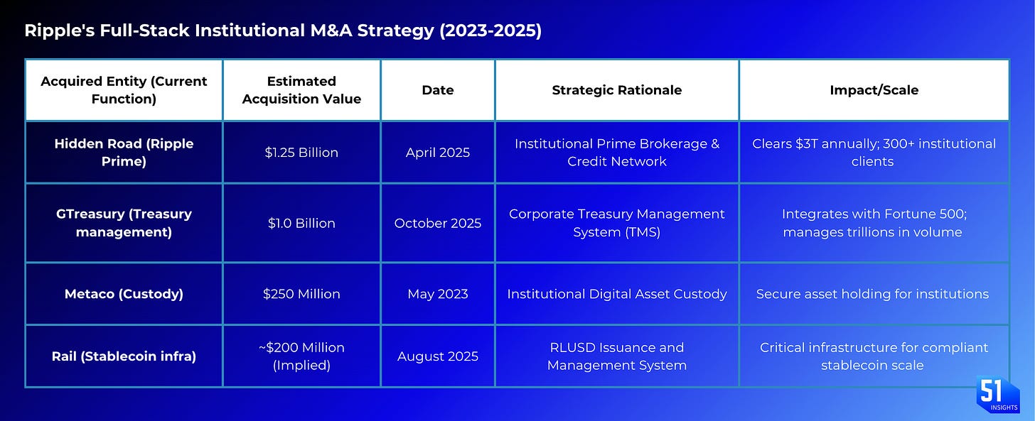 Prime Brokerage: Operating Ripple Prime (aka Hidden Road; acquired in Apr 2025 for $1.25B); handles $3T annually, moves $10B/day, 50M daily transactions