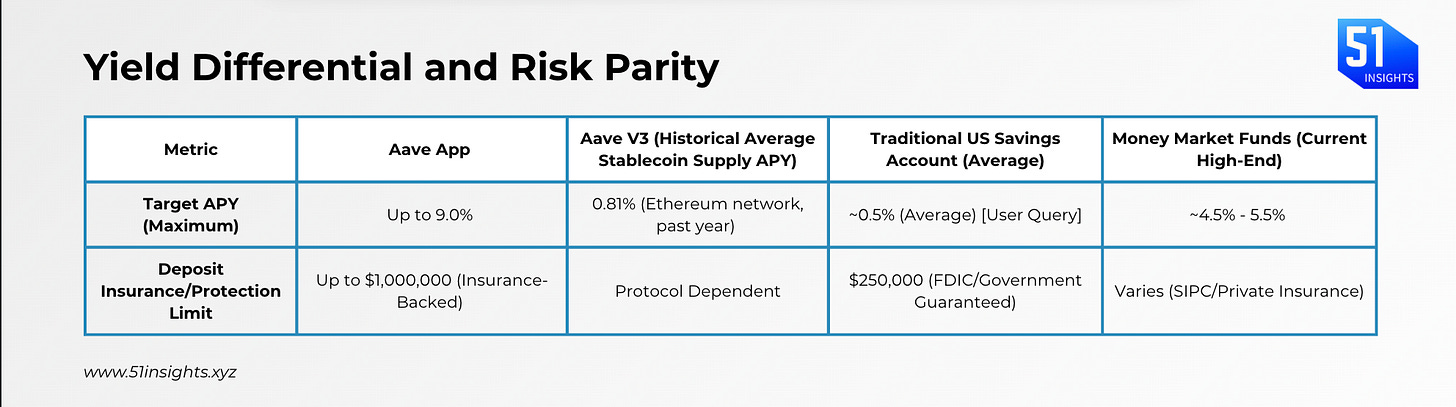 The “Netscape Moment” for DeFi. This is the first time a DeFi protocol has successfully hidden the “crypto.” No wallets. No crypto UX. A user simply downloads an app from the App Store and earns up to 9%. Aave has effectively passed the “Grandma Test.” This expands the Total Addressable Market (TAM) from ~50M crypto-natives to ~5B smartphone users instantly.