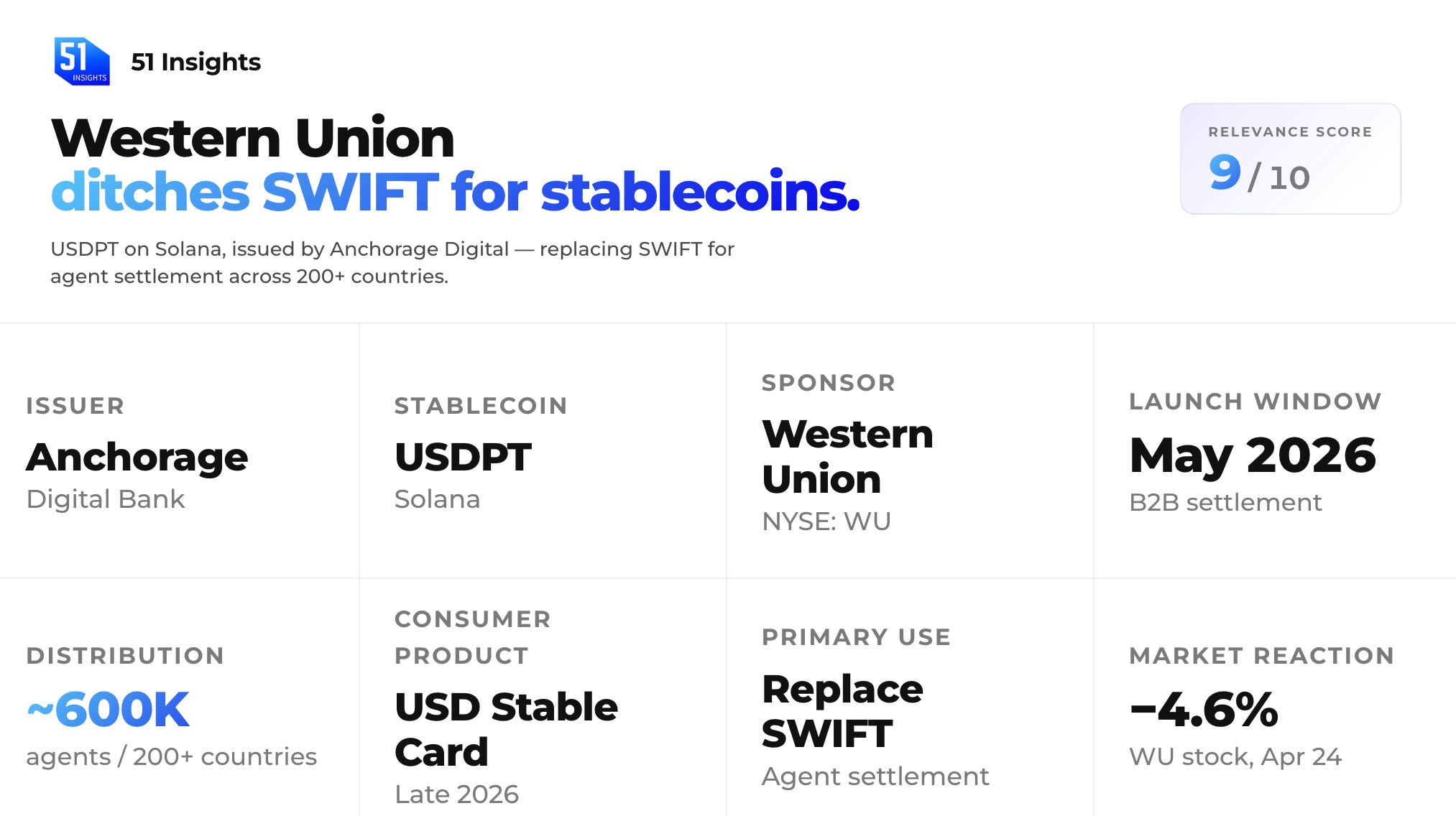 USDPT, a GENIUS Act compliant stablecoin issued by Anchorage Digital Bank, will launch in May 2026 on Solana in select countries with key agent partners. The goal is to replace Western Union’s existing SWIFT-dependent settlement infrastructure, utilized for agent network funding. Unlike the legacy system, on-chain rails enable continuous settlement, operating through weekends and banking holidays. Solana was selected for its low fees and throughput, a fit for the high-volume, low-value remittance profile.