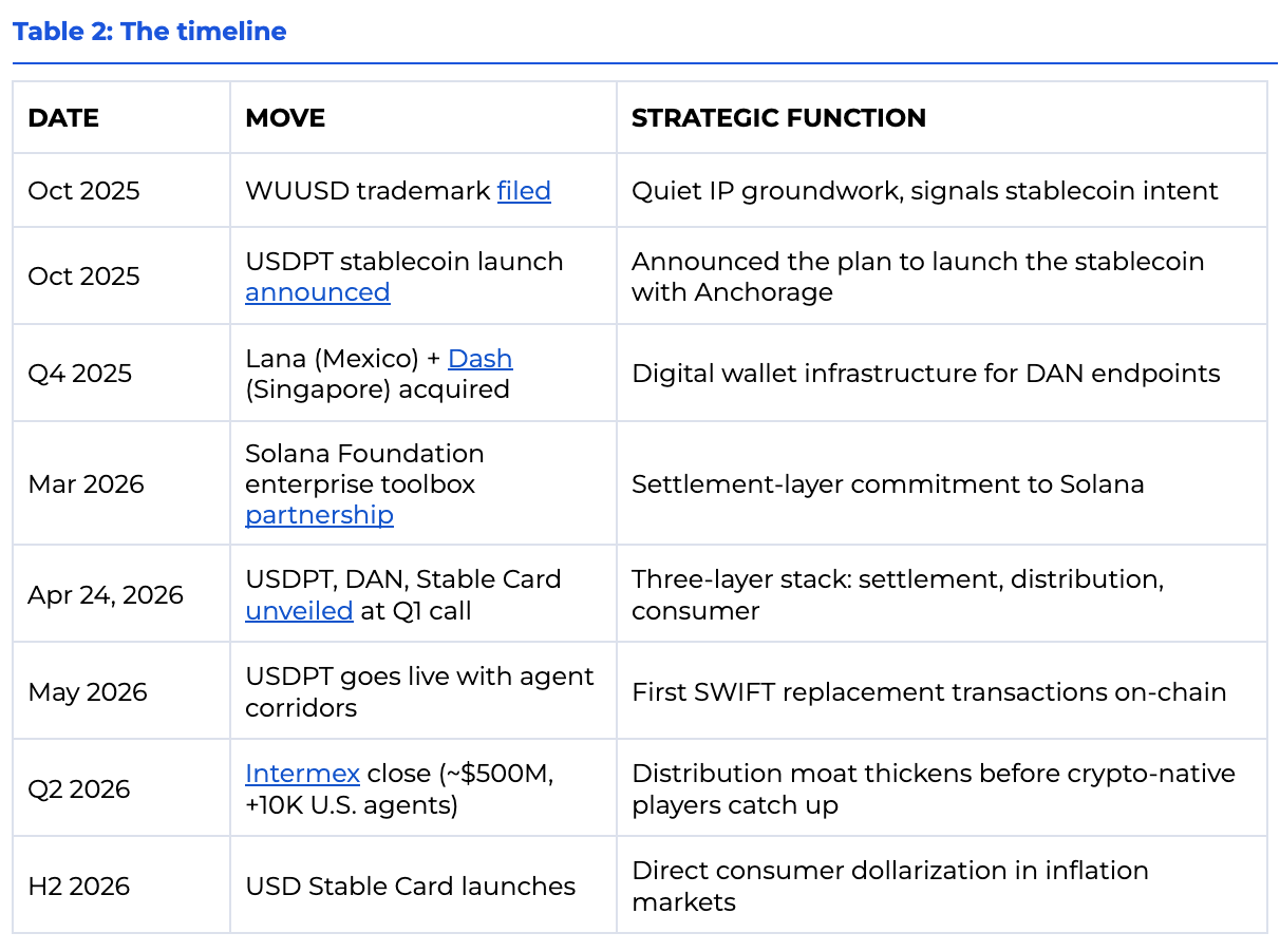 Zooming in: Western Union is building a complete stack: USDPT is the settlement rail, DAN is the distribution layer plugging crypto into 600K cash-out points, and the Stable Card is the consumer wedge into dollarization markets. It is not competing for retail with Circle or Tether but planning on utilising its existing network and use blockchain for scaling and efficiency.