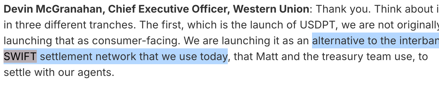 “It is no longer a question of if Western Union will be active in digital assets; it is now how fast we can scale. At the foundation of our strategy is USDPT, our U.S. dollar-backed stablecoin.”