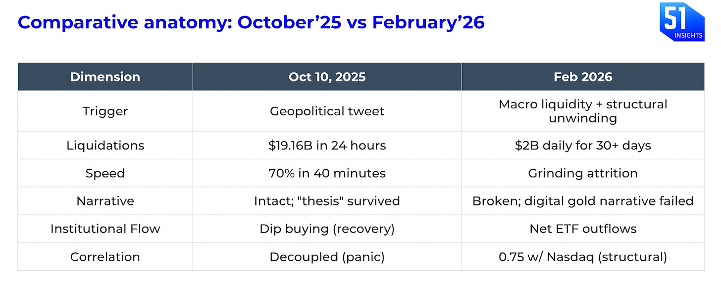 For 18 months, the crypto pitch to allocators was simple: ETFs brought in real money, regulation was coming, and Bitcoin had decoupled from degen retail. Mature asset class. Uncorrelated store of value. Digital gold.