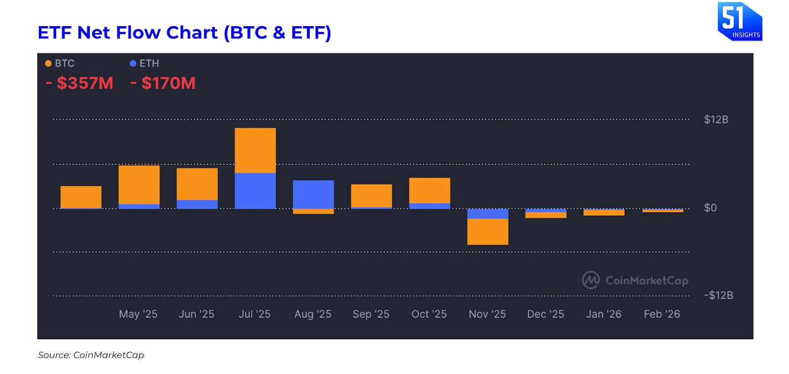 Institutional demand is fading: Hedge funds are exiting the bitcoin basis trade, buying spot ETFs and shorting futures, as yields collapsed from ~17% in 2024 to under 5% in early 2026. Since November 2025, the net ETF flow has been negative with Bitcoin ETF (-$788B) and Ethereum ETF (-$193M) in January.