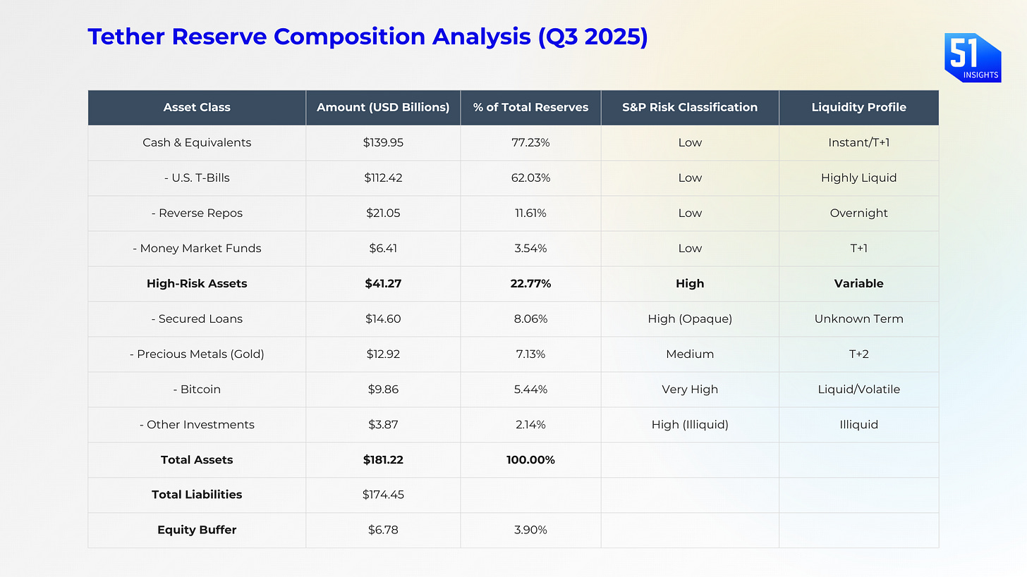 Zooming in: Tether runs a fractional-reserve model where its assets exceed its liabilities, creating a small equity cushion. In Q3 2025, it reported $181.2B in assets against $174.4B in liabilities, leaving about $6.8B in “excess reserves.” That sounds large, but it’s only a 3.9% buffer, a thin margin for an instrument that underpins so much of crypto’s day-to-day liquidity.