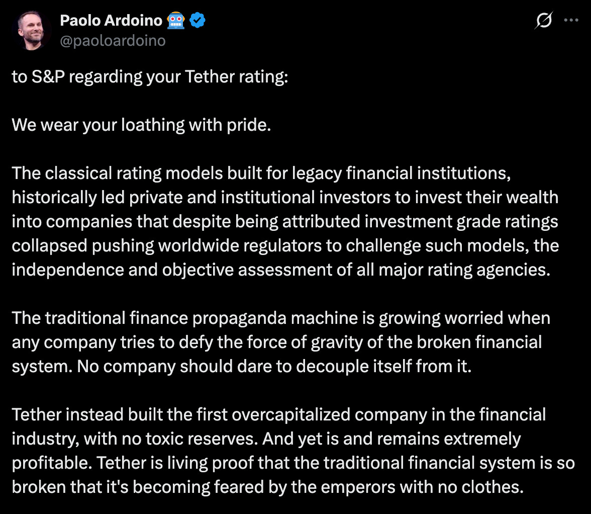So even though Tether’s capital ratio looks higher than a bank’s, it has no safety net. Its 4% buffer is its only protection. S&P’s downgrade is basically saying that 104% coverage isn’t enough for a firm that can’t print money and still holds about a quarter of its assets in volatile instruments.